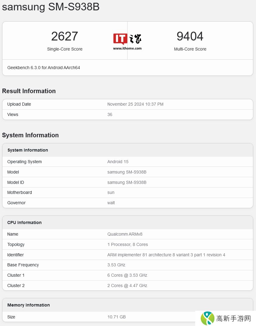 本站查询 GeekBench 跑分库,还发现了三星 Galaxy S25 Ultra 手机的最新跑分成绩,搭载高通骁龙 8 至尊版 for Galaxy 芯片,单核成绩为 2627 分,多核成绩为 9404 分。