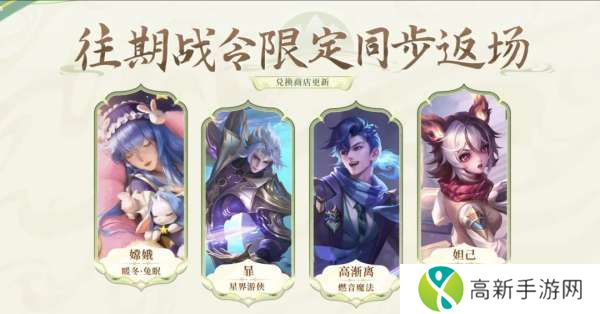 嫦娥-暖冬兔眠、暃-星界游侠、高渐离-燃音魔法和妲己-灵卜魔法,加入战令兑换商店、通过战令币购买礼包获取。