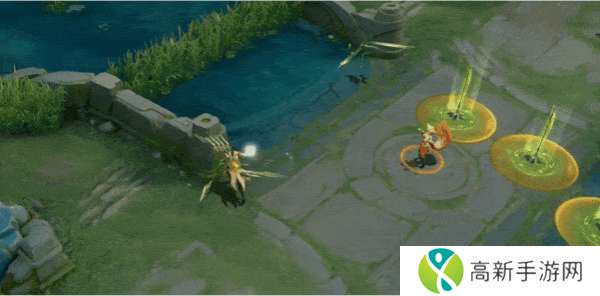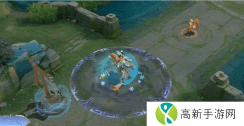 技能特效以青黄色为主,标枪在地面生成茶叶的图案,由于是勇者皮肤因此特效比较简单,不过打击感还是蛮利落的。