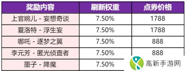 此次加入了五款限定皮肤:上官婉儿-妄想奇谈、夏洛特-浮生妄、哪吒-逐梦之翼、李元芳-匿光侦查者和墨子-降魔。