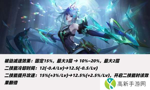 二技能攻速从15%-30%改为12.5%-25%,二技能期间攻速加成翻倍。