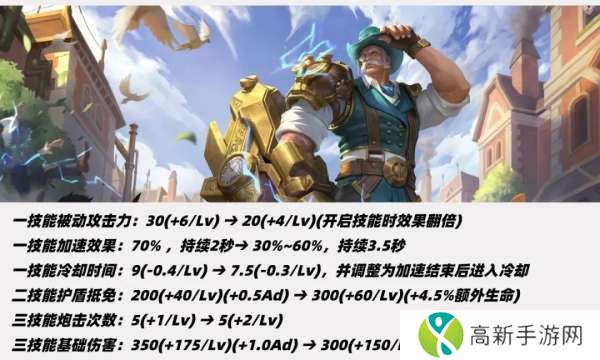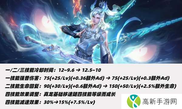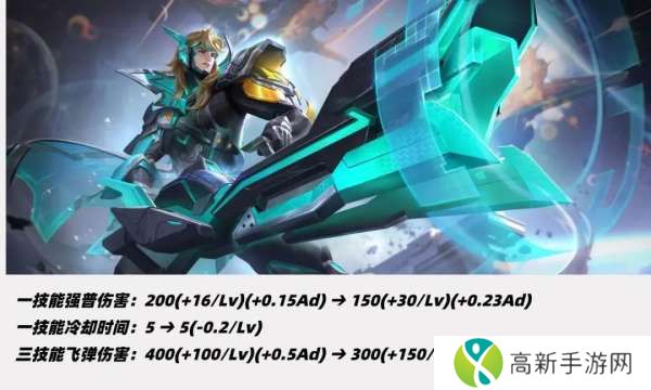 一技能下调50点基础伤害、上调14点等级成长和0.07AD加成,一技能冷却前期不变、满级缩短1秒。
