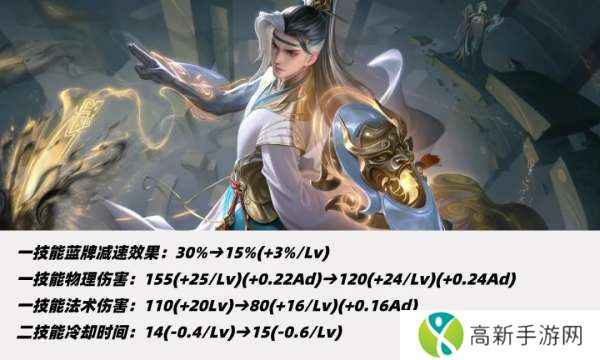一技能蓝牌减速从30%调整至15%-30%,二技能前期增加1秒、满级不变。
