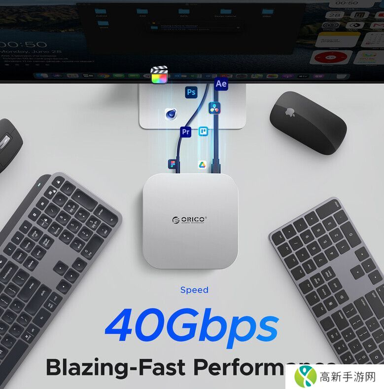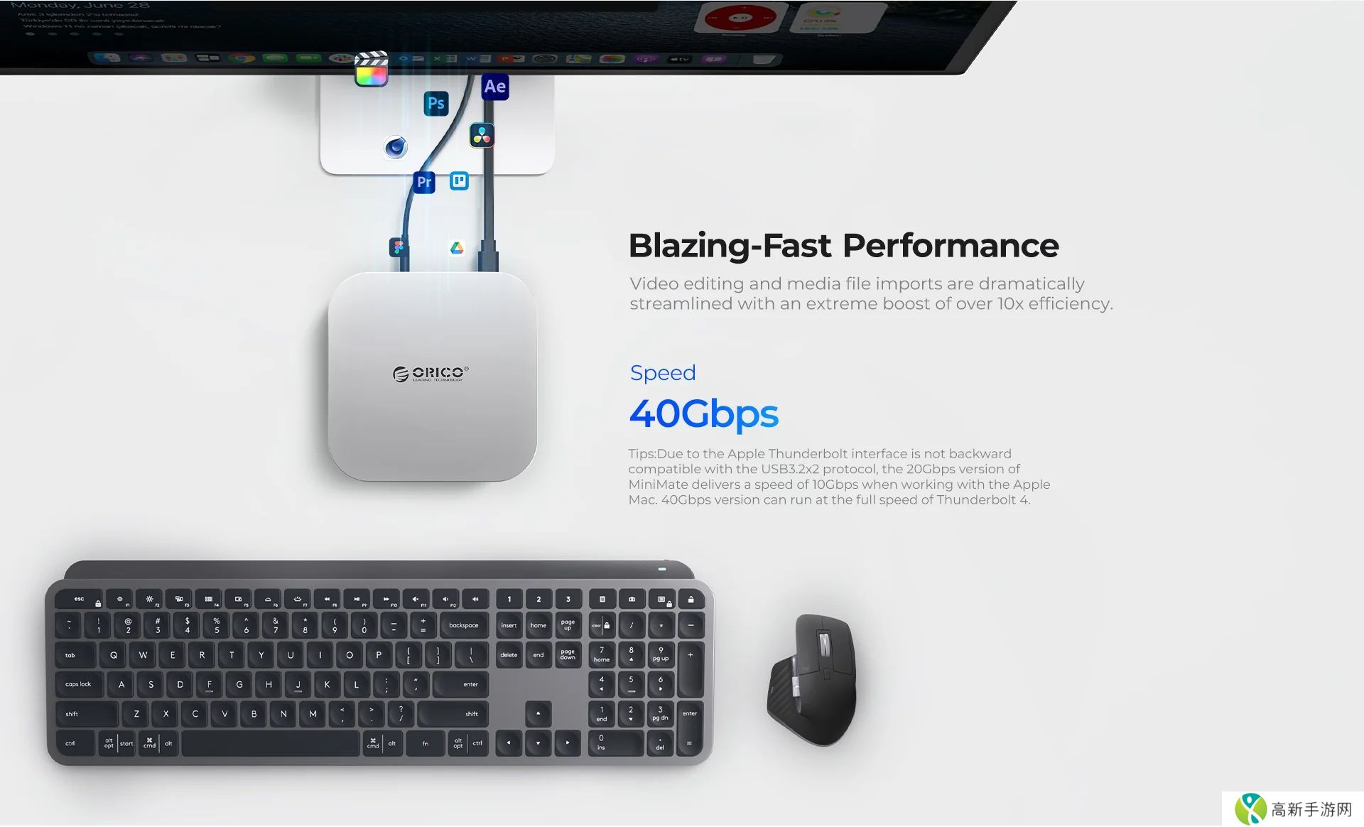 MiniMate 最高传输速度可达 40 Gbps,完美匹配 Mac mini 的高速性能,可以加快图形设计、视频编辑、3D 渲染等专业软件的运行速度,提高工作效率。
