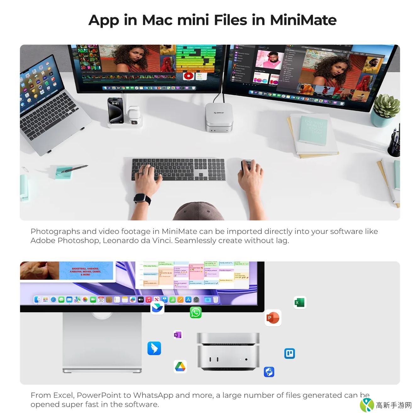 官方表示 MiniMate 的尺寸和外观设计与 Mac mini 协调一致,紧贴 Mac mini 放置,浑然一体,提升桌面美感。