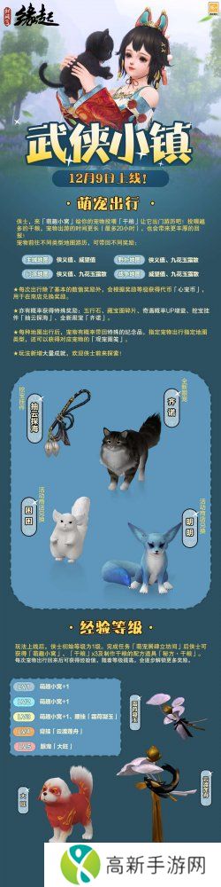 武侠小镇萌宠工程**完成,全新玩法“宠游天下”开启。侠士可前往成都广都镇西侧找寻【秦玉川】,帮助爱宠准备出行干粮,开启萌宠冒险之旅,有机会获得金叶子、藏宝图碎片等珍稀物品;随着萌宠出行解锁“萌宠居”等级,还可获取【萌趣小窝】、挂件【云渡莲舟】、【霜荷凝玉】跟宠【大旺】等丰富奖励。快带上你的爱宠一起出发吧!