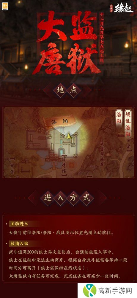 一剑斩愁,除恶虏影。为维护江湖安定,官府决定修建大唐** !12月9日之后,武斗值满200的侠士重伤后将被强制送入大唐**,待武斗值消除后方可离开。完成**内额外任务可减少惩罚时间,提前释放。侠士们快来探索别样的江湖机制,感受更刺激的江湖风云!
