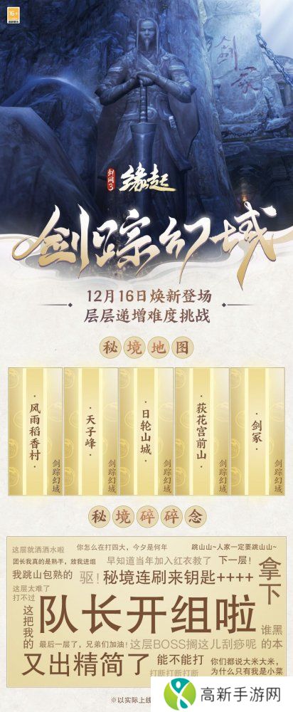 全新秘境挑战玩法「剑踪幻域」将于12月16日上线,「风雨稻香村·幻域」「天子峰·幻域」「日轮山城·幻域」「荻花宫前山·幻域」「剑冢·幻域」五大幻域登场,层层递增的难度设计,全新挑战体验,为经典秘境焕发新的生机!