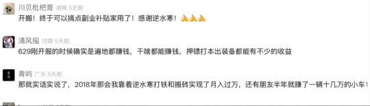并且像这位老哥一样吃到螃蟹的玩家还不在少数!在神豪老板扎堆的大环境下,靠逆水寒赚大学生活费的有,给大佬代练、打造武器补贴家用的也有,堪称是全服共富。要知道当年PDD在逆水寒就豪掷了上千万,而花给官方的却只有50万,剩下的950万全是购买其他玩家的装备和打造材料。凭借“赚钱就像呼吸一样简单”,629版本成了很多老玩家乃至晚入坑的萌新心心念念的“白月光”。