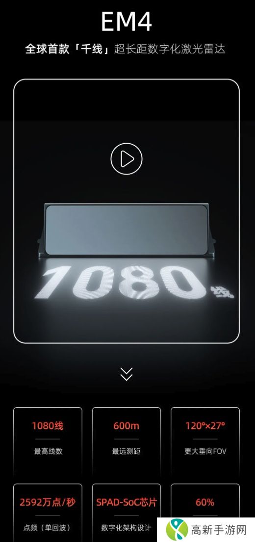 EM4 作为 RoboSense 全新数字化架构 EM 平台的首款产品,是全球首款 1080 线的激光雷达,最远测距 600 m,垂向 FOV 120° x 27°,点频 2,592 万点 / 秒,具备最高 0.050°x0.025° 角分辨率和超长测距,可为汽车提供 1080P 三维感知力,可以更清晰地探测到 600 m 内的白色车辆、300 m 内的交通锥桶、180 m 内的轮胎,并由此提高车辆紧急避让或刹停的最高时速。