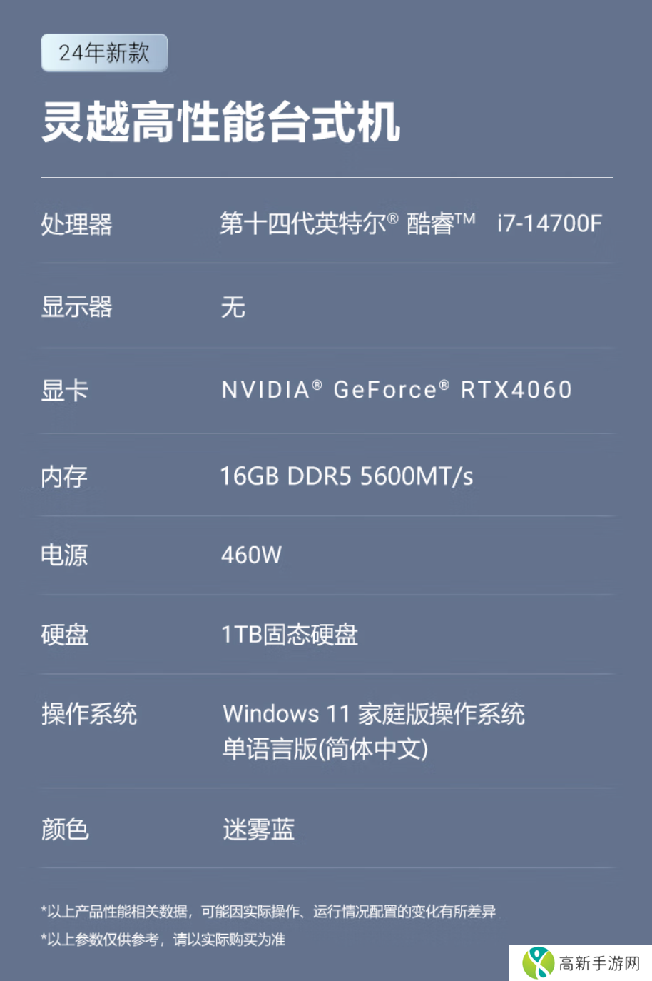 该机配备20核心28线程英特尔酷睿i7-14700F处理器,配备16GB DDR5 5600 RAM和1TB PCIe SSD,内置RTX4060显卡,配备“460W电源”。