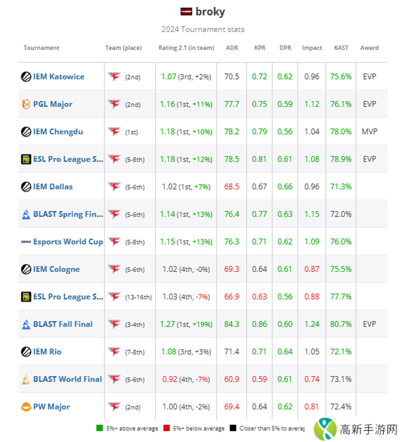 broky在CS2发布后推动FaZe连续八次闯入总决赛,并在FaZe的低谷期依然保持强劲势头,这足以让他在2024年成为队内排名最高的选手。