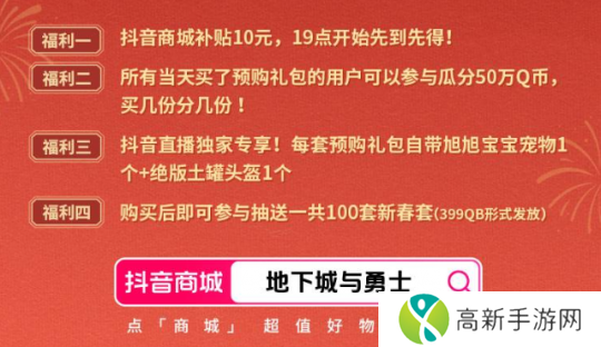 既然是带货,肯定就少不了“为家人们谋福利”的砍价环节,目前已知抖音商城为DNF新春礼包补贴10元,19点开始先到先得!还有预售瓜分Q币活动,买几份就能分几份!当天晚上参与活动预购礼包,还将获得旭旭宝宝限定宠物和土罐头盔装扮一个;同时可以参与直播间福袋抽奖,抽取100套新春套!