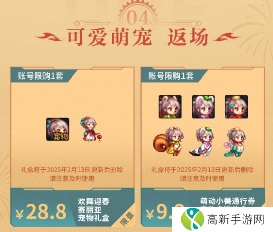 商品方面,本次勇士年货节除了新春礼包,还有58元、66元的动物套返场;49元的魔剑武器装扮礼包、15元的像素武器装扮礼包、38元的异世相逢阿拉德武器装扮礼包,以及28.8元和9.9元的赛丽亚宠物礼盒。以上返场商品基本都是曾经的限定纪念外观,暖暖党这次有福了。