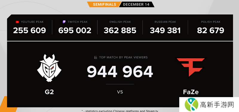 这场比赛的峰值观众人数为944964,接近100万。而之前的开幕赛阶段和正赛阶段比赛的观众人数稳定在30-50万左右。FaZe和G2两支队伍的号召力可见一斑。