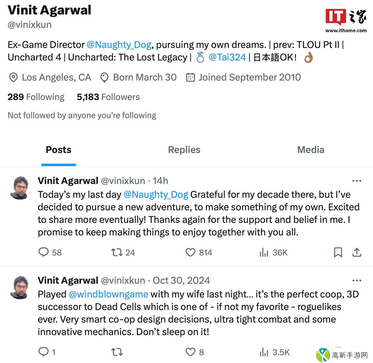 本站 1 月 11 日消息,顽皮狗游戏总监 Vinit Agarwal 今日在 X 平台发文,宣布其已从顽皮狗离职。