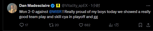 赛后,Vitality官推和选手们发布了动态,表达了对于晋级的感受。