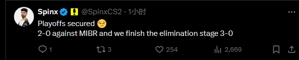 “成功进入淘汰赛,2-0战胜了MIBR,以3-0的成绩结束了正赛阶段。”