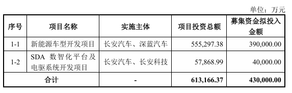 本站从公告获悉,扣除发行费用后的募集资金净额将投资于新能源车型开发及产品平台技术升级项目和全球研发中心建设及核心能力提升项目。本次发行的股票数量为 5.09 亿股,不超过本次发行前公司总股本的 30%。兵器装备集团拟认购金额为 15 亿元,中国长安拟认购金额为 10 亿元,南方资产拟认购金额为 35 亿元。
