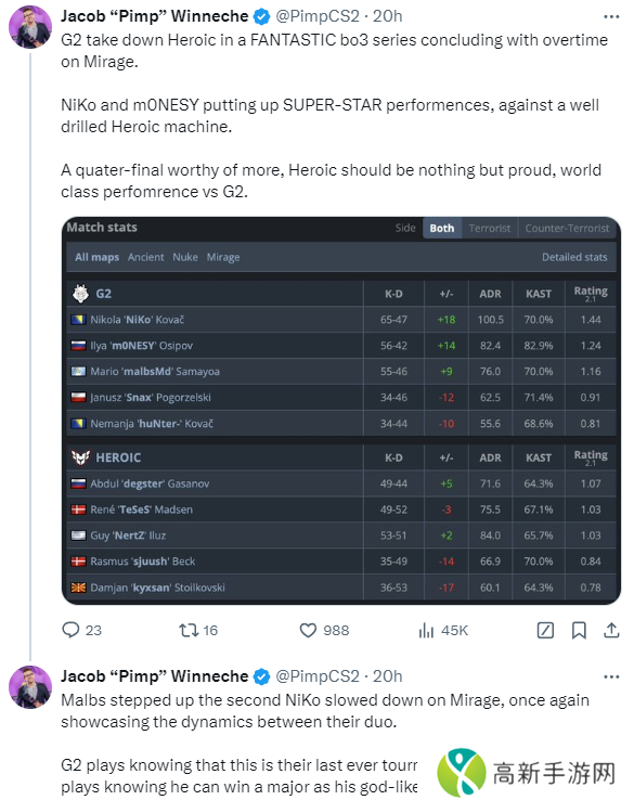 “G2凭借在Mirage加时赛的精彩表现击败了HEROIC。NiKo和m0NESY以超级明星的表现,最终在BO3比赛中战胜了训练有素,执行力如同机器一般的HEROIC。