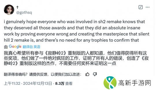 X上一名粉丝表示:“我真心希望所有参与过《寂静岭2》重制版的人都知道,他们理应获得所有这些奖项,他们做了一件绝对疯狂的事,证明了所有人都错了,并创造出了《寂静岭2》重制版这部杰作,这一点无需任何奖杯来证明。”