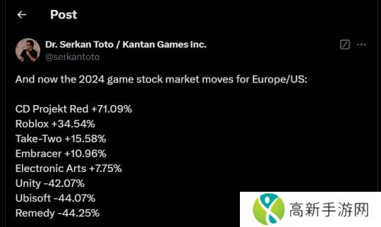 继发布了2024年日本游戏公司股价上涨情况后,Kantan Games分析师Dr.Serkan Toto近日又发布了欧美游戏公司2024年涨跌详情。引人瞩目的是,2024年涨幅最高的欧美游戏公司竟是CDPR,涨幅高达71.09%。随后是Roblox(34.54%),Take Two(15.58),Embracer(10.96%),EA(7.75%)。