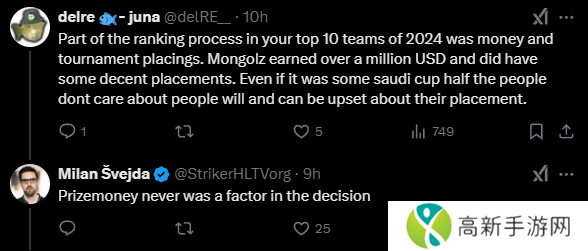 下方网友质疑:“2024年度最佳战队TOP10中,排名的一部分标准是奖金和比赛名次。那蒙古战队在2024年奖金收入超过了100万美元,也取得了一些不错的成绩。即便有些奖金都是从那些没有多少人关注的沙特杯赛中获得的,但还是有人对他们的排名感到不解和质疑。”