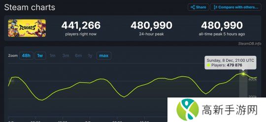 SteamDB显示,《漫威争锋》在线峰值出现在5个小时前,为48万人,但没有超过同期发售的付费游戏《流放之路2》,后者Steam峰值为57.8万人,打破了昨天的记录(54万人)。