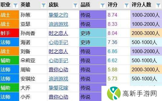 当年不足100天后,孙策颇为意外地又携大乔获得了520皮肤。这也是小霸王的“翻身之战”——尽管同为传说规格,但挚爱之约的口碑明显优于挚爱花嫁。皮肤颜值高手感好,大招不再乘船而是改为拉马车也非常有创意。这款皮肤砍下8.7分,是2022年的第二高分传说,仅次于鲁班虎限。也是迄今最高分的520皮肤。从这款皮肤开始,尽管孙策还总是和大乔一起出皮肤,但之后每次的皮肤规格都高于自己CP.