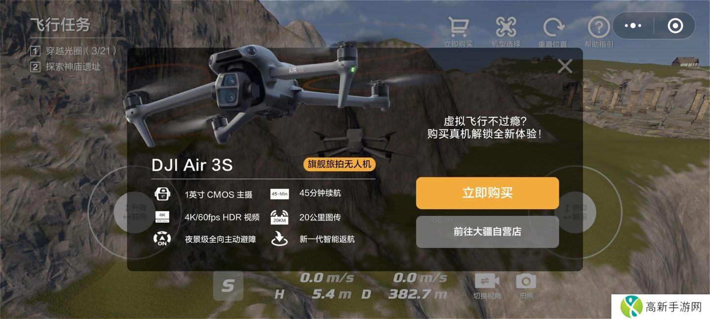 目前,该虚拟飞行小程序中可选 DJI Air 3S、DJI Mini 4 Pro、DJI Mavic 3 Pro 三款无人机,除了“一键试飞”外,用户也可以点击购买直接跳转至大疆小程序下单无人机。