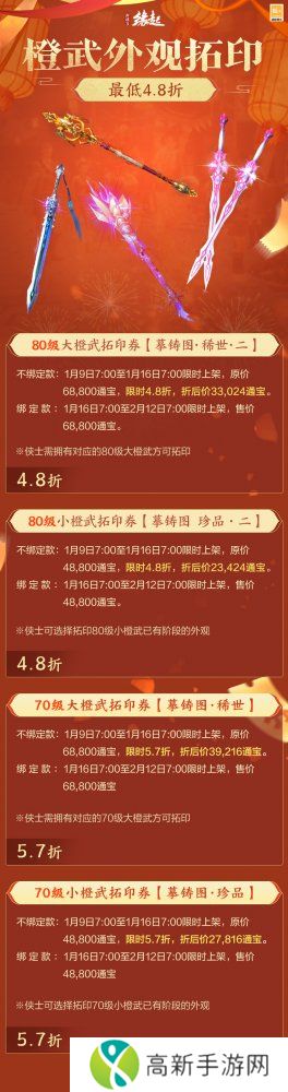 80级大橙武拓印券「摹铸图·稀世·二」、80小橙武拓印券「摹铸图·珍品·二」限时特惠4.8折,70级大橙武拓印券「摹铸图·稀世」、70小橙武拓印券「摹铸图·珍品」享限时5.7折惊喜返场!