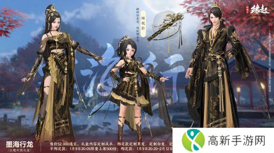暮色四合,如浓墨重彩泼于绢帛之上。成男款衣着豪迈大气,一身玄色劲装,绣以金龙腾云图案,威风凛凛。宽袍大袖,颇具盛唐气概,领口处饰以毛绒,更显其英武之气。成女款裙裾摇曳,如同盛开的墨莲,金线勾勒的山水云纹在其上蜿蜒,流光溢彩。肩披轻纱,如雾气般笼罩,又轻薄如蝉翼,盈盈欲坠。萝莉款裙摆轻盈,翩跹如蝶翼,似有暗香浮动。腰间以束带紧拢,更显其娉婷身姿。