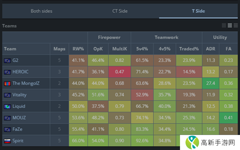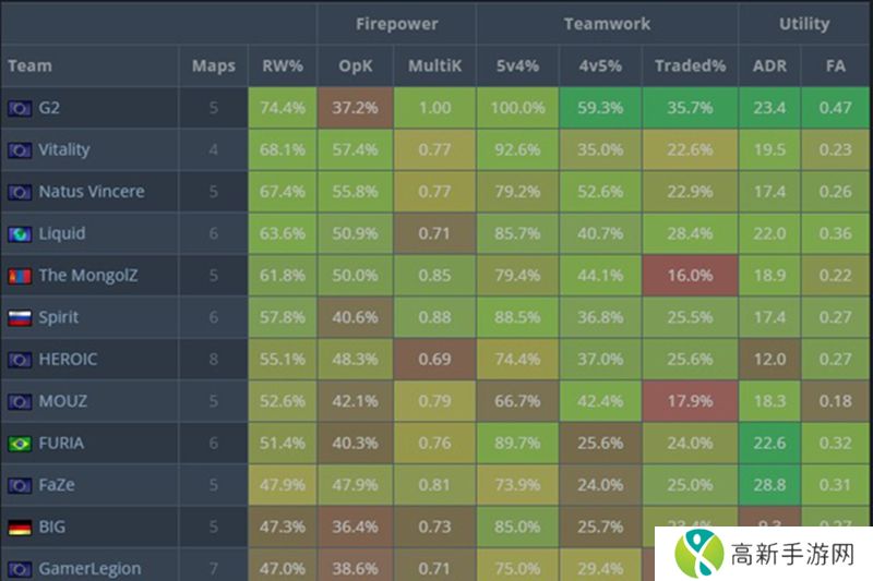 而从队伍的攻守双方数据看,G2战队在进攻方的表现有了天差地别的变化。他们是正赛阶段进攻方回合胜率最高的战队,达到了74.4%。