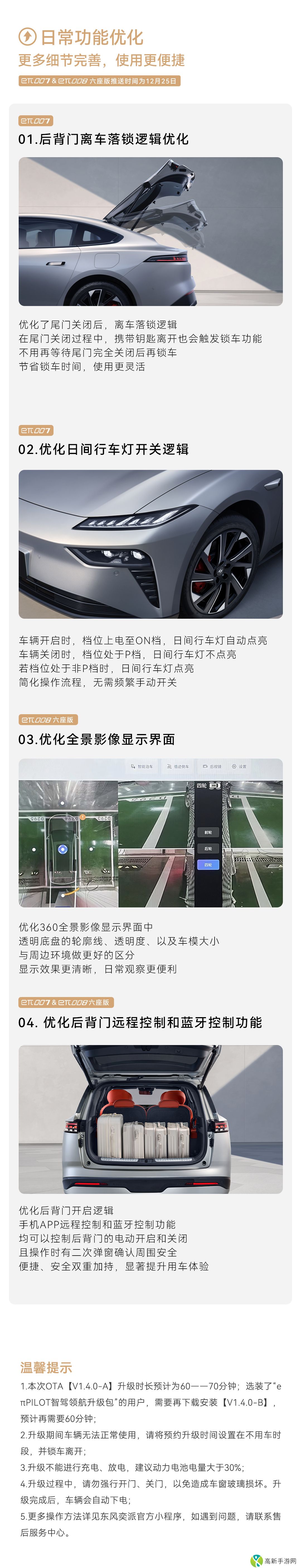 本站 12 月 25 日消息,东风奕派官方今日宣布,东风奕派 eπ007、东风奕派 eπ008 六座版获推 OTA 1 4 0 升级,即日起陆续推送。本站汇总更新内容如下:高阶智驾优化12 月 25