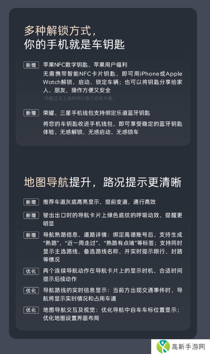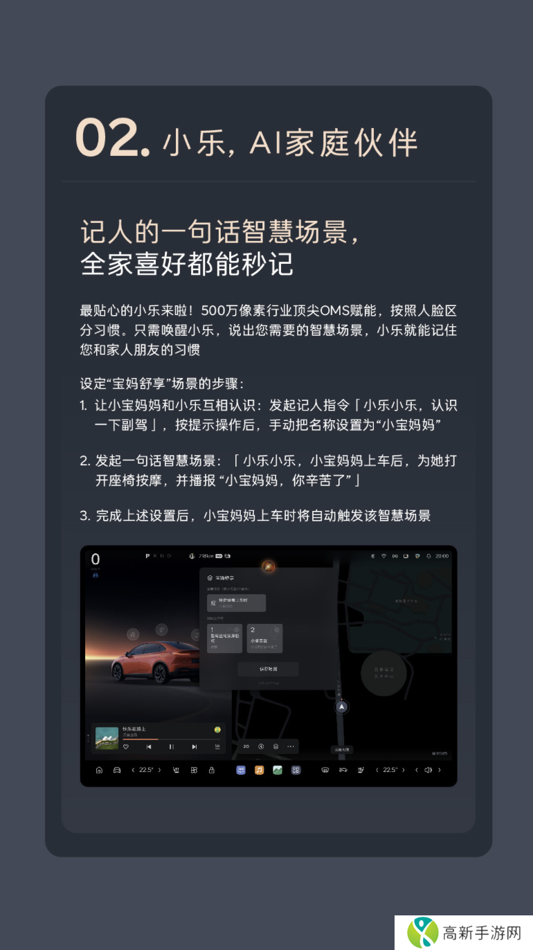 本次 OTA 新增“小乐”AI 家庭伙伴,具有“记人的一句话智慧场景”功能,通过 OMS 乘客监测系统,按照人脸区分习惯,可设定“宝妈舒享”等智慧场景;新增宝贝守护提示音,包含儿童护眼提醒、儿童座椅温度异常提醒、儿童防夹提醒、儿童锁上锁提醒;新增网易云音乐语音控制 / 语音点歌、语音调节前 / 后排出风模式、语音调节方向盘加热挡位等车控语音指令。