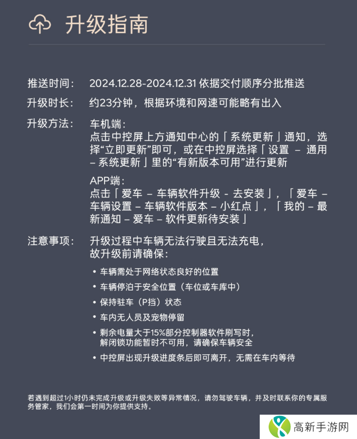 OTA 方面,本站获悉本次更新将从2024 年 12 月 28 日(今天)开始依据交付顺序分批推送,12 月 31 日全部推送完成,升级时间约 23 分钟。