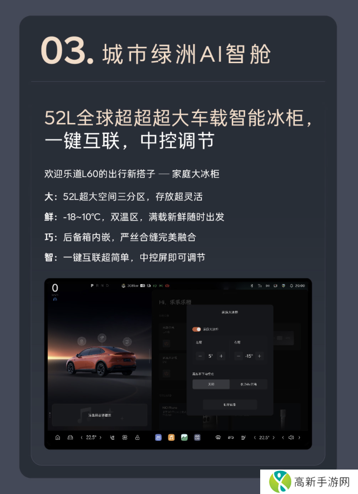 此外,车机还新增爱奇艺热门院线影视作品、全屏观影模式以及 6 款小游戏。地图导航新增推荐车道灰底高亮显示、驶出出口时的导航卡片上绿色底纹的呼吸动效、导航熟路信息 / 道路详情;优化导航路线的实时信息显示、地图导航交互及视觉等。同时支持中控调节 52 升家庭大冰柜。