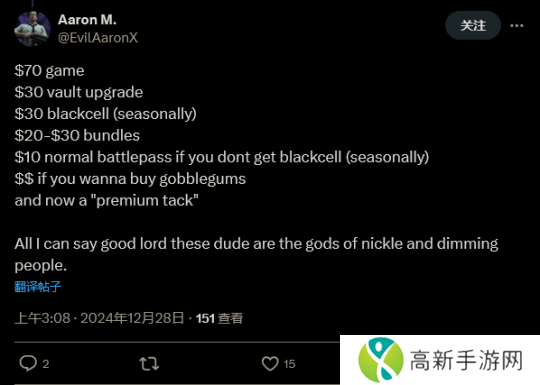 许多玩家对此非常不满。以为玩家说道:“想象一下,你每个赛季额外为 Blackcell 花 30 美元,然后他们还想从你这里挤出更多的钱。”另一位玩家抱怨道:“我只能说,天呐,这群人(动视)简直就是割韭菜之神。”