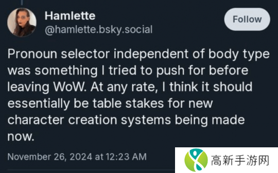更令人没想到的是,这件事还炸出了一些潜水的隐藏大鱼。一位前暴雪员工在X上支持起了黑曜石的做法,为此她还表示:“独立于身体类型的性别代词选择是我在离开《魔兽世界》之前尝试推动的东西。无论如何,我认为这应该成为现在角色创建系统的必备元素。”