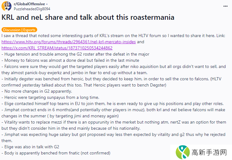 以上消息源于KRL与neL的直播,由HLTV和reddit论坛网友整理汇总,并非由爆料人书面形式爆料。真实性上有待商榷,只算是提供了转会期的一些更多细节,仅供读者分析。
