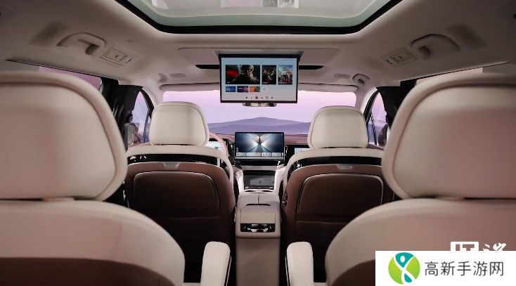 新车采用 2+2+3 的三排七座布局,前排配备了 15.6 英寸悬浮式中控屏、12.3 英寸副驾娱乐屏、15.6 英寸中央吸顶屏组合,配备手机无线充电、双杯槽以及岛台下方的置物槽。