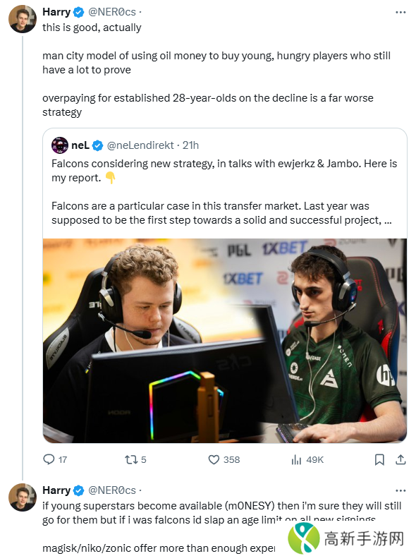 昨日,法国知名爆料人neL发布动态称Falcons正在考虑新的阵容组建策略,并与ewjerkz和jambo进行接触。针对此事,HLTV编辑NER0分享了自己的看法,在他看来,这是个不错的策略。相关阅读