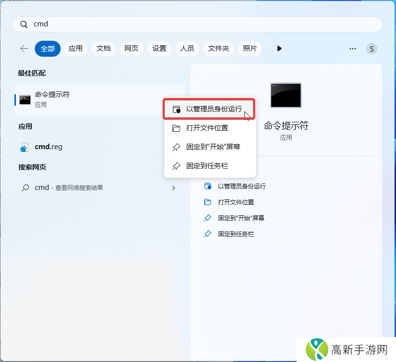 3. 按下 Win 键(或者使用鼠标)打开开始菜单,搜索“cmd”或“命令提示符”,然后右键选择“以管理员身份运行”。