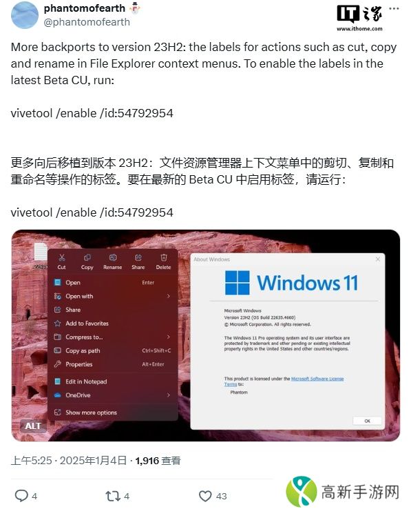 当前位置:首页>手游攻略> 微软将 Win11 24H2 新特性移植到 23H2,包括文件资源管理器右键菜单中的复制、剪切、重命名等标签