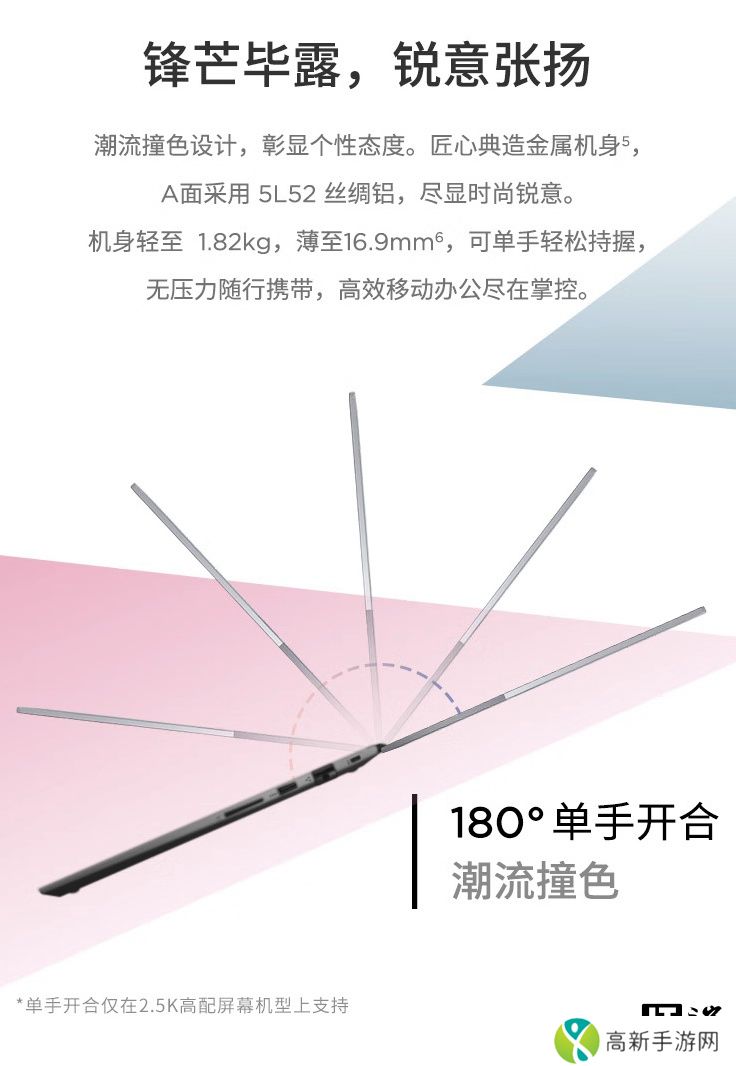 该机A面采用5L52丝绸铝,机身整体重量1.82千克,厚度为16.9mm,笔记本支持180度单手开合,机身内置71 WHr电池。