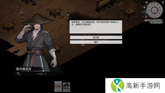 当然,在打坐的时候会消耗时间,目标NPC经常会自行走动,所以可以选中NPC肖像上的追索,并在每个城镇的客栈处,找一个叫做隐月楼密探的NPC,他可以帮你找到NPC的位置,虽然需要花钱,但需求的非常少,推荐使用。
