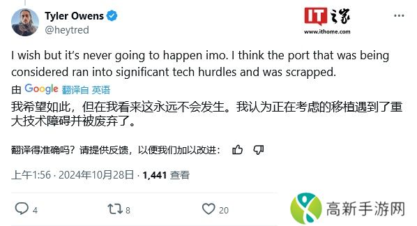 本站翻译他的推文内容如下:“我希望能实现,但在我看来这是不可能的。我认为之前考虑过的那个移植项目遇到了重大的技术难题,最终被放弃了。”