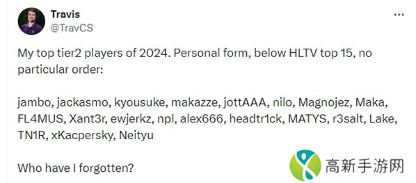 “我心目中的2024年二线选手名单。根据个人表现,队伍HLTV排名在15名之外,以下排名不分先后顺序。”