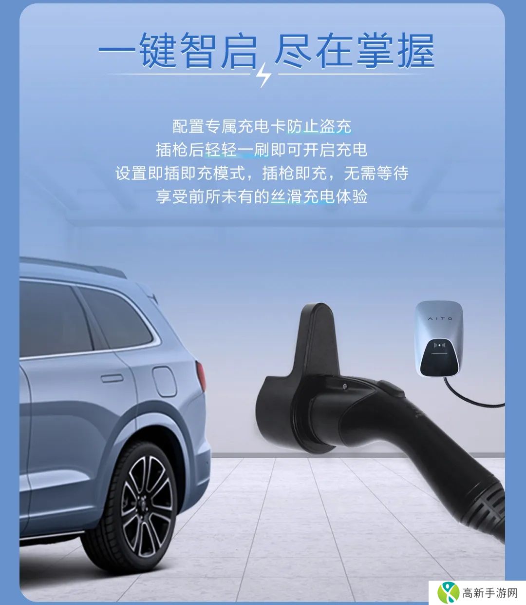 问界 2.0 PRO 家充桩配置专属充电卡防止盗充,插枪后轻轻一刷即可开启充电;可设置即插即充模式,插枪即充。