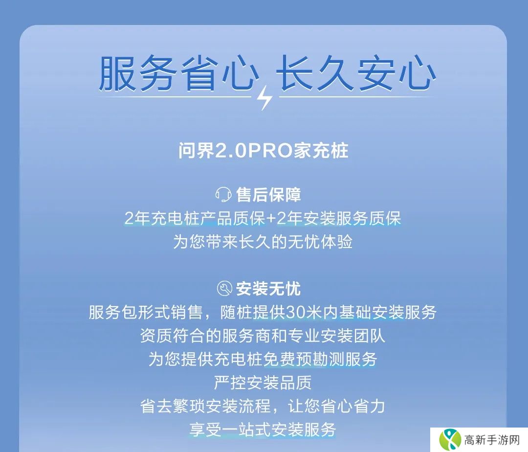 服务方面,问界 2.0 PRO 家充桩提供 2 年充电桩产品质保 + 2 年安装服务质保;随桩提供 30 米内基础安装服务,享受一站式安装服务。